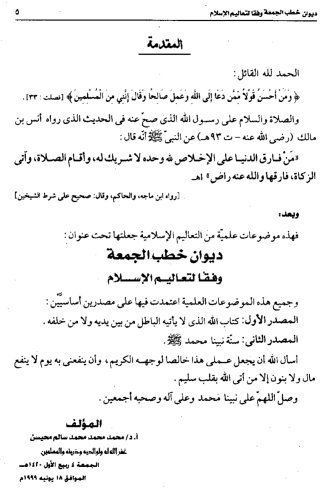 ديوان خُطب الجمعة وفقًا لتعاليم الإسلامديوان خُطب الجمعة وفقًا لتعاليم الإسلام: قال المُصنِّف - رحمه الله -: «فهذه موضوعات علميَّة من التعاليم الإسلامية .. اعتمدتُ فيها على مصدرين أساسيين: المصدر الأول: كتاب الله الذي لا يأتيه الباطلُ من بين يديه ومن خلفه. المصدر الثاني: سنة نبيِّنا محمد - صلى الله عليه وسلم -». | محمد سالم محيسن |
