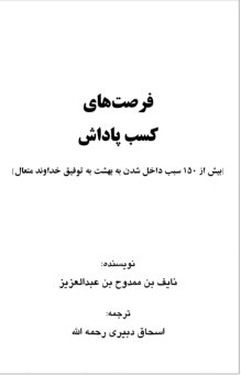 فرص كسب الثواب وأكثر من 175 سبب لدخول الجنة ( فارسي )فرص كسب الثواب وأكثر من 175 سبب لدخول الجنة برحمة الله : يتناول الكتاب فضائل الأعمال، والفرص الواردة في السنة التي ينال صاحبها الثواب والأجر من الله - تبارك وتعالى -. نایف بن ممدوح بن عبدالعزیز آل سعود سایت عقیده http://www.aqeedeh.com فرصتهای کسب پاداش [بیش از 150 سبب داخل شدن به بهشت به توفیق خداوند متعال] این کتاب در مورد موضوعهایی مربوط به بعضی از فضایلِ اعمالی است که از کتابِ خداوندِ متعال یعنی قرآن و آن احادیثی که به صورتِ صحیح به پیامبر اکرم نسبت داده شده است اسم اين كتاب «فرصتهای کسب پاداش – و بیش از 150 سبب واردکنندهی بهشت» به رحمت و عفو و گذشت و منّت خداوند سبحان، مي باشد. | نایف بن ممدوح بن عبدالعزیز آل سعود |