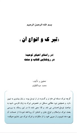 التبرك وأنواعه ( فارسي )التبرك وأنواعه: كتابٌ ذكر فيه مؤلفه بعض الشركيات التي يقع فيها كثير من الناس، ومنها: التبرك بالأولياء والصالحين، كما بيَّن التبرُّك المشروع، وذكر الأدلة من الكتاب والسنة على ذلك. سایت عقیده http://www.aqeedeh.com تبرک و انواع آن گرچه تبرک مسئله ای عام تر و گسترده تر از توسل بوده و نیاز بیشتری به تبیین دارد. و همچنین نبود مطالبی مستقل در خصوص تبرک به زبان فارسی، شبیه به مباحث توسل،احساس می شد. و لذا سعی شده تا در این رساله، به بررسی بحث تبرک دراسلام و انواع جایز و ناجایز آن پرداخته شود.تا از حسنات آن بهره مند شویم و از سویی خود را از منکرات و شرک تبرک دور نماییم | |