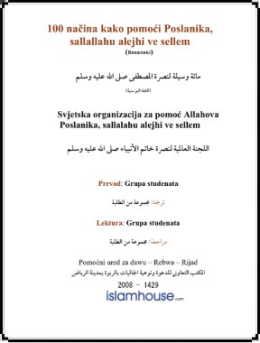 مائة وسيلة لنصرة المصطفى صلى الله عليه وسلم ( بوسني )مقالة أعدتها اللجنة العالمية لنصرة خاتم الأنبياء - صلى الله عليه وسلم - تحتوي على العديد من الوسائل التي يمكن من خلالها نصرة نبينا - صلى الله عليه وسلم - وذلك على مستوى الفرد، أو على مستوى الأسرة والمجتمع، أو على مستوى قطاع التعليم والعاملين فيه، أو على مستوى الأئمة و الدعاة وطلبة العلم، أو على مستوى المثقفين والمفكرين ... Stotinu načina kako pomoći Allahova Poslanika, sallalahu alejhi ve sellem Kratka knjiga koju je pripremila Svjetska organizacija za pomoć Allahova Poslanika, sallalahu alejhi ve sellem, a sazdana je od 99 načina kako pomoći dawu Allahova Poslanika, svako od nas u svojim mogućnostima, te tako steći veliku nagradu na Ahiretu. | |