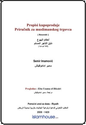 دليل التاجر المسلم ( بوسني )الكتاب الفريد باللغة البوسنية حيث جمع مؤلفه أحكاما تخص التجار في معاملاتهم التجارية عبر وسائلها المختلفة. Priručnik za muslimanskog trgovca Jedinstvena knjižica na našim prostorima. Sadrži propise o kupoprodajnim međuodnosima. | Semir Imamović |