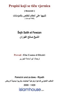 تنبيهات على أحكام تختص بالمؤمنات ( بوسني )تنبيهات على أحكام تختص بالمؤمنات: يحتوي على بعض الأحكام التي ينبغي أن تحرص كل امرأة على معرفتها، مثل: أحكام تختص بالتزيين الجسمي للمرأة، والحيض والاستحاضة والنفاس، واللباس والحجاب، والصلاة والصيام، والحج والعمرة، مع بيان بعض الأحكام التي تختص بالزوجية وبإنهائها. Upozorenja na propise koji se tiču vjernice Sastoji se od velikog broja propisa koji se tiču žene vjernice od ukrašavanja pa do namaza i posta. | Salih ibn Fevzan el Fevzan |