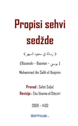 رسالة في سجود السهو ( بوسني )إن كثيراً من الناس يجهلون كثيراً من أحكام سجود السهو في الصلاة، فمنهم من يترك سجود السهو في محل وجوبه، ومنهم من يسجد في غير محله، ومنهم من يجعل سجود السهو قبل السلام وإن كان موضعه بعده، ومنهم من يسجد بعد السلام وإن كان موضعه قبله، ولذا كانت معرفة أحكامه مهمة جداً لاسيما للأئمة الذين يقتدي الناس بهم، وتقلدوا المسئولية في اتباع ... Propisi sehvi sedžde Doista, ima mnogo ljudi koji neznaju mnoge propise vezane za sehvi sedždu u namazu, neki ostavljaju sehvi sedždu iako je vadžib, neki je čine ali ne na pravom mjestu, neki prije selama iako treba poslije ili suprotno, učini sehvi sedždu nakon selama iako treba prije. Zbog toga spoznaja propisa sehvi sedžde je veoma bitna, a posebno imamima i hodžama za kojima klanjaju drugi ljudi i koji su preuzeli na sebe odgovornost u propisanom sljeđenju u njihovim namazima u kojima predvode druge muslimane, pa smo htjeli da vam pružimo priliku da se okoristite ovom korisnom knjigom od našeg šejha Muhammeda ibn Saliha el Usejmina, r.h. | Muhammed Salih Usejmin |