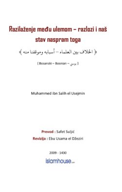 الخلاف بين العلماء – أسبابه وموقفنا منه ( بوسني )موضوع الخلاف بين العلماء قد يثير التساؤل لدى الكثيرين، وقد يسأل البعض: لماذا هذا الموضوع؟ وهذا العنوان الذي قد يكون غيره من مسائل الدين أهم منه؟ ولكن هذا العنوان وخاصة في وقتنا الحاضر يشغل بال كثير من الناس، لا نقول من العامة بل حتى من طلبة العلم، وذلك أنها كثرت في وسائل الإعلام نشر الأحكام وبثّها بين الأنام، وأصبح ... Razilaženje među ulemom – razlozi i naš stav naspram toga Tema razlaza među učenjacima (pa i daijama) može izazvati pitanja kod mnogih kao: Zašto ova tema? Ovo nije bitno kao što su druge stvari vjere? No, međutim, ova tema, posebno u današnje vrijeme, je okupirala mnoge, ne kažemo obični svijet nego i studente - talibe ilma, zbog aktivnog, kontinuiranog i raznovrsnog prenošenja propisa putem sredstava informisanja i to među običnim svijetom, gdje je razlaz među dvojicom daija postao izvorom zabune, pa čak i sumnje kod mnogih ljudi, a posebno običnog svijeta koji ne poznaje izvore dotičnog razlaza. Zbog toga vam predstavljamo knjigu od šejha Usejmina, r.h. u kojoj šejh govori o ovoj veoma bitnoj temi kod svih muslimana. | Muhammed Salih Usejmin |