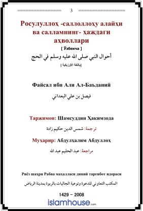 أحوال النبي صلى الله عليه وسلم في الحج ( أوزبكي )هذا الكتاب عبارة عن دراسة تحاول إعطاء توصيف شامل وصورة أوضح عن أحواله - صلى الله عليه وسلم - في الحج، وقد تكونت من ثلاثة فصول: الأول: أحوال النبي صلى الله عليه وسلم في الحج مع ربه. الثاني: أحوال النبي صلى الله عليه وسلم في الحج مع أمته. الثالث: أحوال النبي صلى الله عليه وسلم في الحج مع أهله. Росулуллоҳ -саллоллоҳу алайҳи ва салламнинг- ҳаждаги аҳволлари Кўпчилик мусулмонлар ҳаж ибодати аҳкомларини билишлик билан гина кифояланиб, Расулуллоҳ саллаллоҳу алайҳи ва салламнинг ҳаждаги аҳволлари ва шахсий намуналарини билмайди. Ушбу китоб Росулуллоҳ саллоллоҳу алайҳи ва салламнинг ҳаж ибодати асносидаги иймоний ва тааббудий ҳамда инсонларга ва оилаларига бўлган ўзаро муомалалари қандай бўлганлиги ҳақида сўз юритади. | Файсал ибн Али Ал Баъданий |